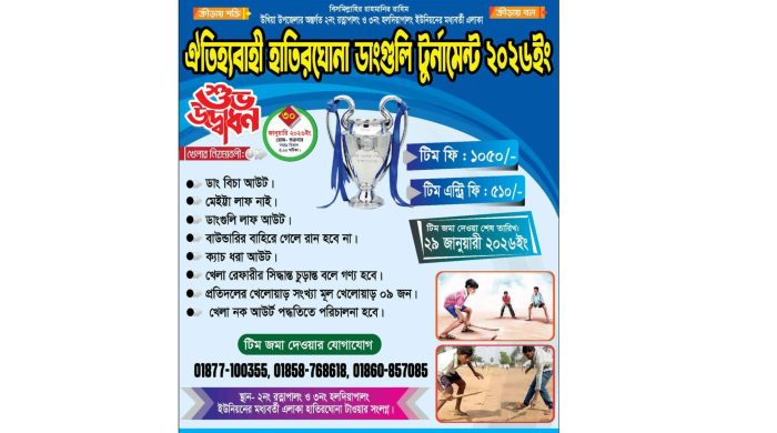 গ্রামের হারিয়ে যেতে বসা ঐতিহ্যবাহী খেলা ডাংগুলিকে নতুন করে প্রাণ ফিরিয়ে দিতে উখিয়া উপজেলায় আয়োজন করা হয়েছে ডাংগুলি টুর্নামেন্ট-২০২৬ইং। আগামী শুক্রবার (৩০ জানুয়ারি ২০২৬ইং) বিকেল ৩টা থেকে এ টুর্নামেন্টের খেলা